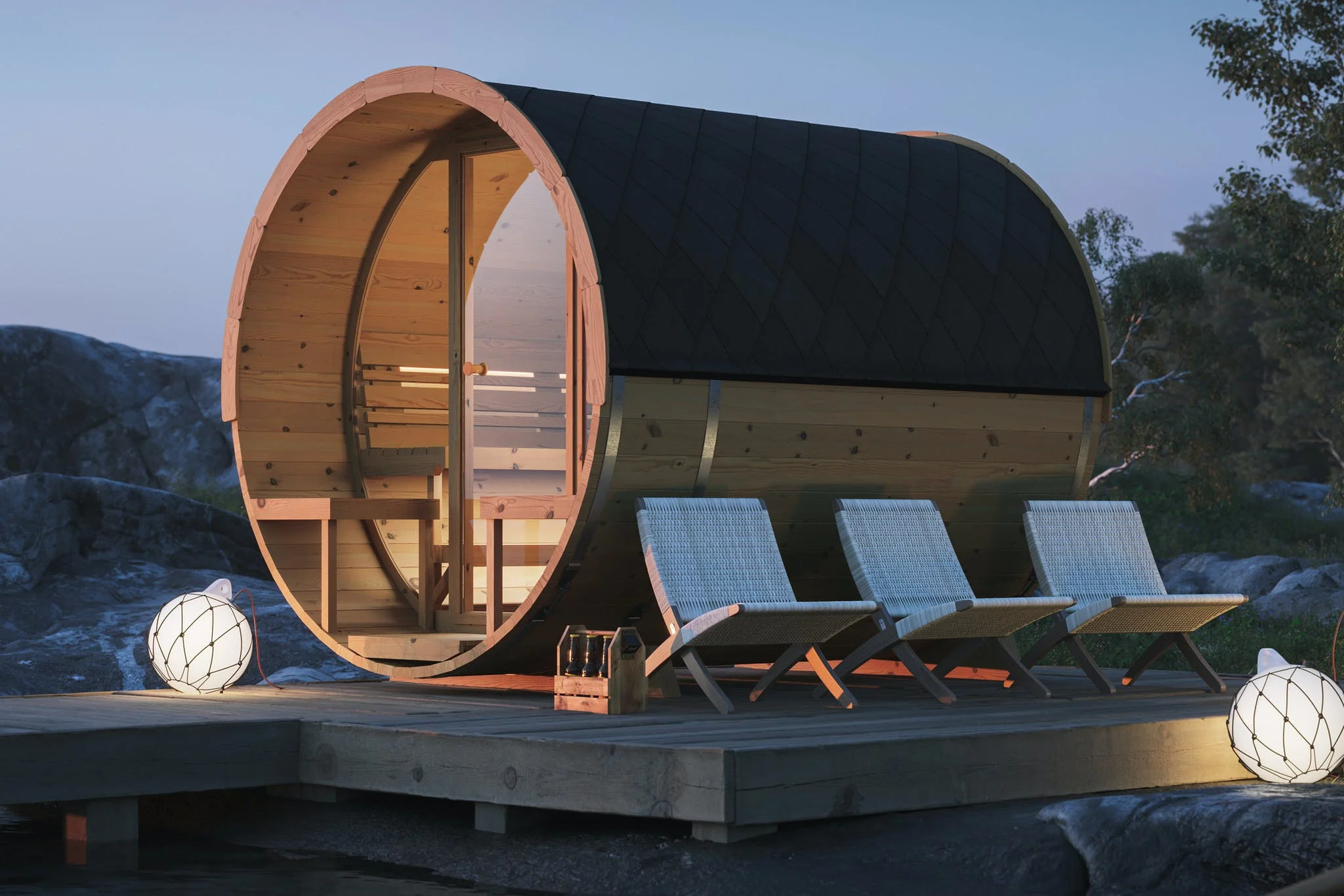 - Red cedar barrel sauna (W1.8 m × L1.8 m) with benches & tempered door